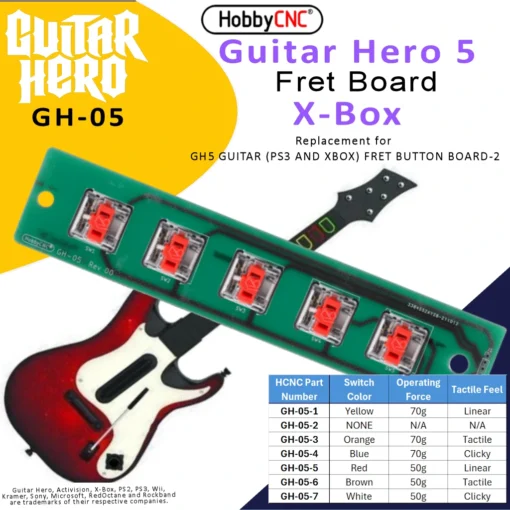 Replacement fret printed circuit board for the GH5 Guitar on xBox, PS3. Exact replacement for original GH5 GUITAR (PS3 AND XBOX) FRET BUTTON BOARD-2 board. Uses the same wiring. Can be ordered as a board only or board with 5 switches installed.