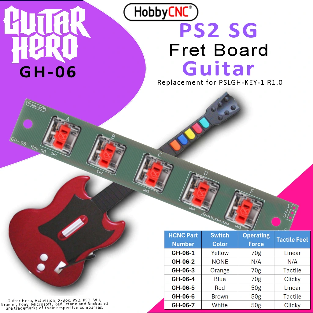 Replacement fret printed circuit board for the PSLGH Guitar on PS2. Exact replacement for original PSLGH-KEY-1 R1.0 board. Uses the same wiring. Can be ordered as a board only or board with 5 switches installed.