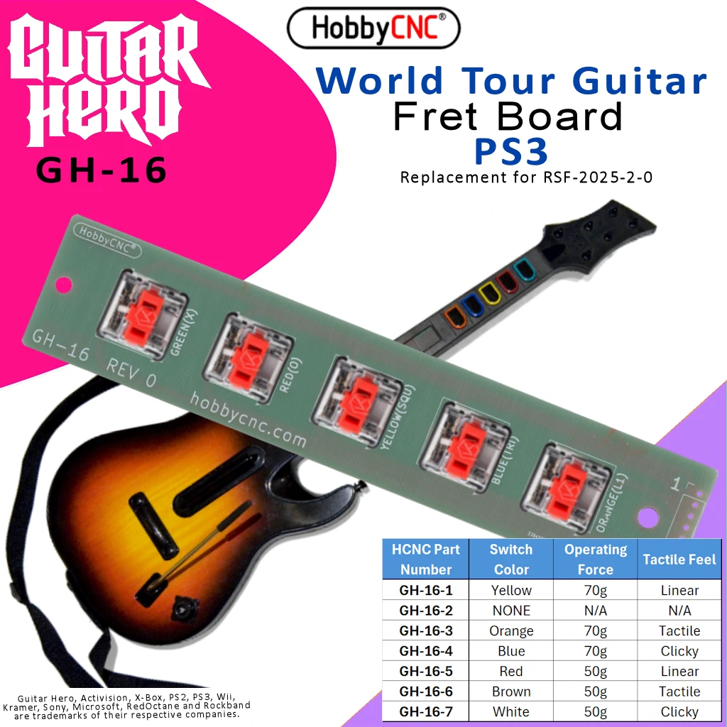 Replacement fret printed circuit board for the World Tour Wireless Guitar for PS3. Exact replacement for original board. Uses the same wiring. Can be ordered as a board only or board with 5 switches installed.