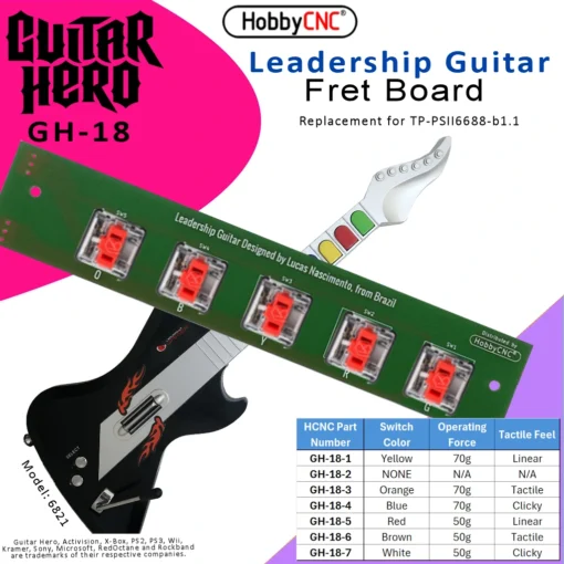 Replacement fret printed circuit board for the Leadership Guitar. Exact replacement for original board (TP-PSII6688-b11). Uses the same wiring. Can be ordered as a board only or board with 5 switches installed.